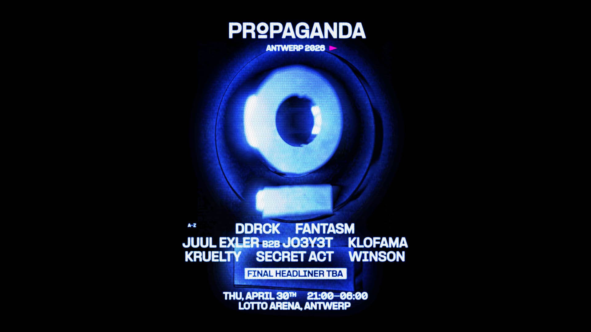 De Lotto Arena opent haar deuren voor Propaganda, een nacht waarin harde techno de toon zet. Acht headliners, waaronder DDRCK, JUUL EXLER B2B JO3Y3T en WINSON, brengen sets die de grenzen van sound en intensiteit opzoeken. Voeg daar een geheim act en een nog te onthullen headliner aan toe, en je krijgt een onvergetelijke nacht.