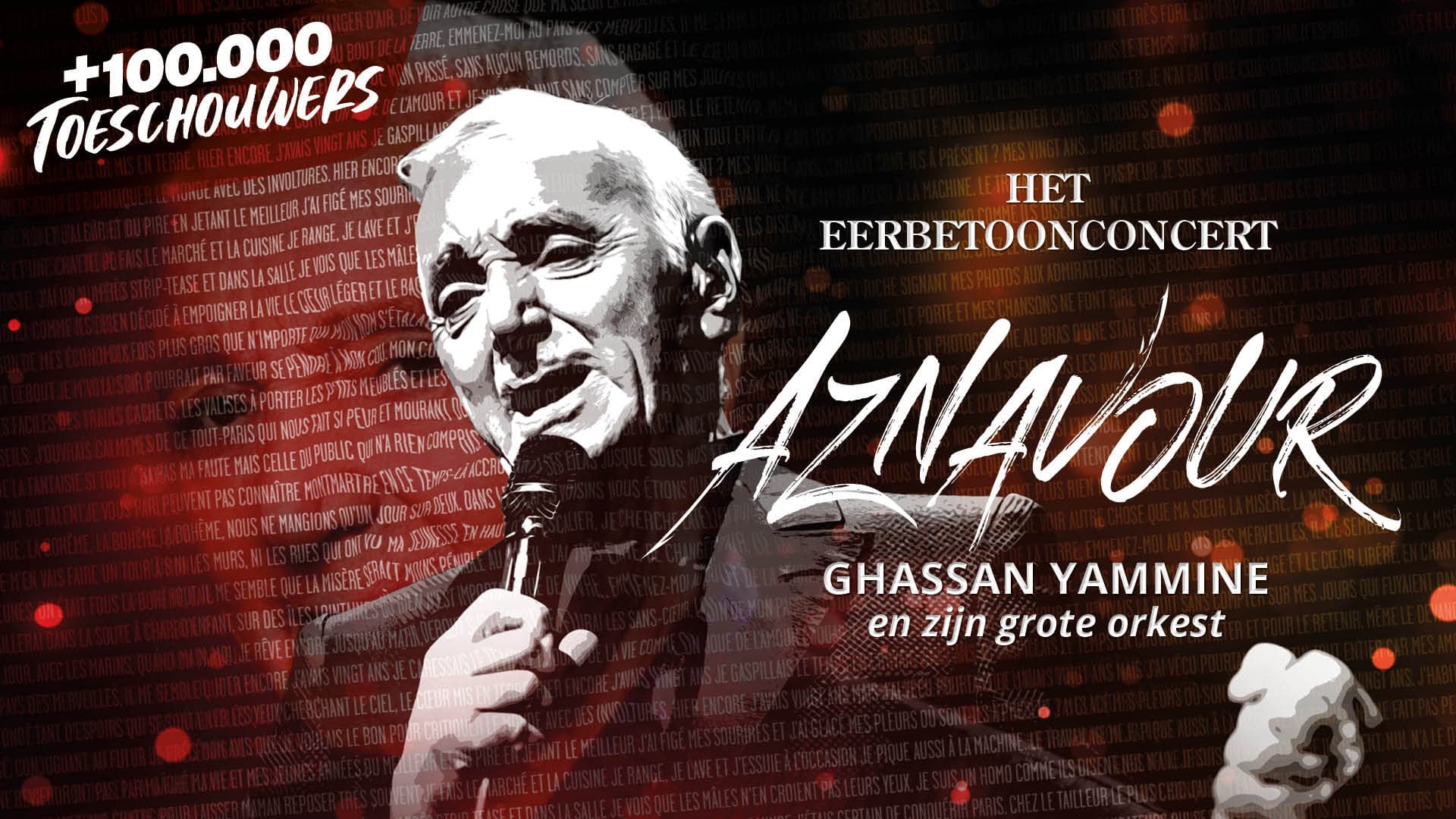 Inspiré de son concert au Palais des Congrès de Paris en 1991, le spectacle « Ghassan Yammine chante Aznavour – Le Concert Hommage » est certainement aussi captivant que le film récent sur sa vie. Ghassan et son orchestre interprètent brillamment ses plus belles chansons, une présentation sobre de grande classe, tout est mis en place pour un superbe spectacle de près de deux heures !